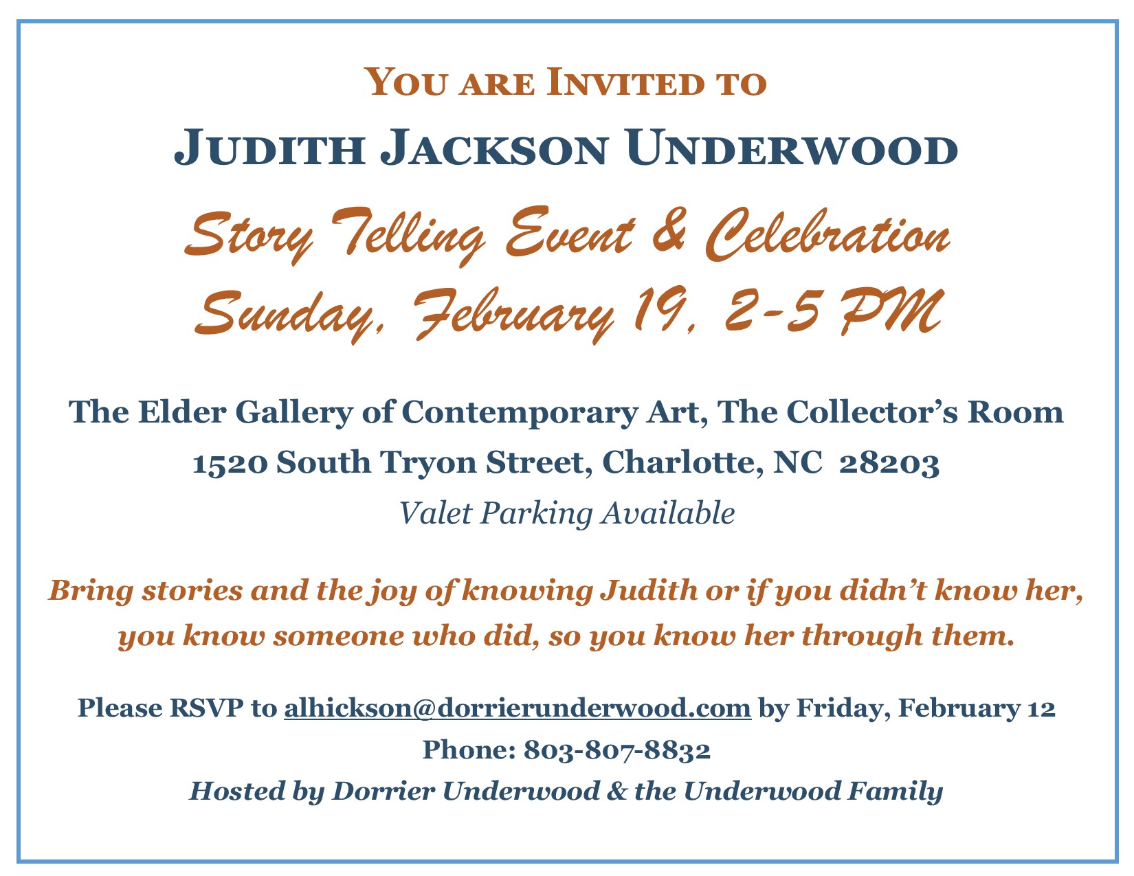 If you are coming to the celebration as advertised below you can click on this link alhickson@dorrierunderwood to RSVP via email.
